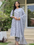 Elevate your ethnic wardrobe with this graceful grey Anarkali suit set. Made from soft cotton blend fabric, the outfit features an all-over paisley and floral print in soothing white tones. The beautifully flared kurta is adorned with mirror work, lace detailing, and delicate embroidery on the yoke, giving it a touch of festive elegance.