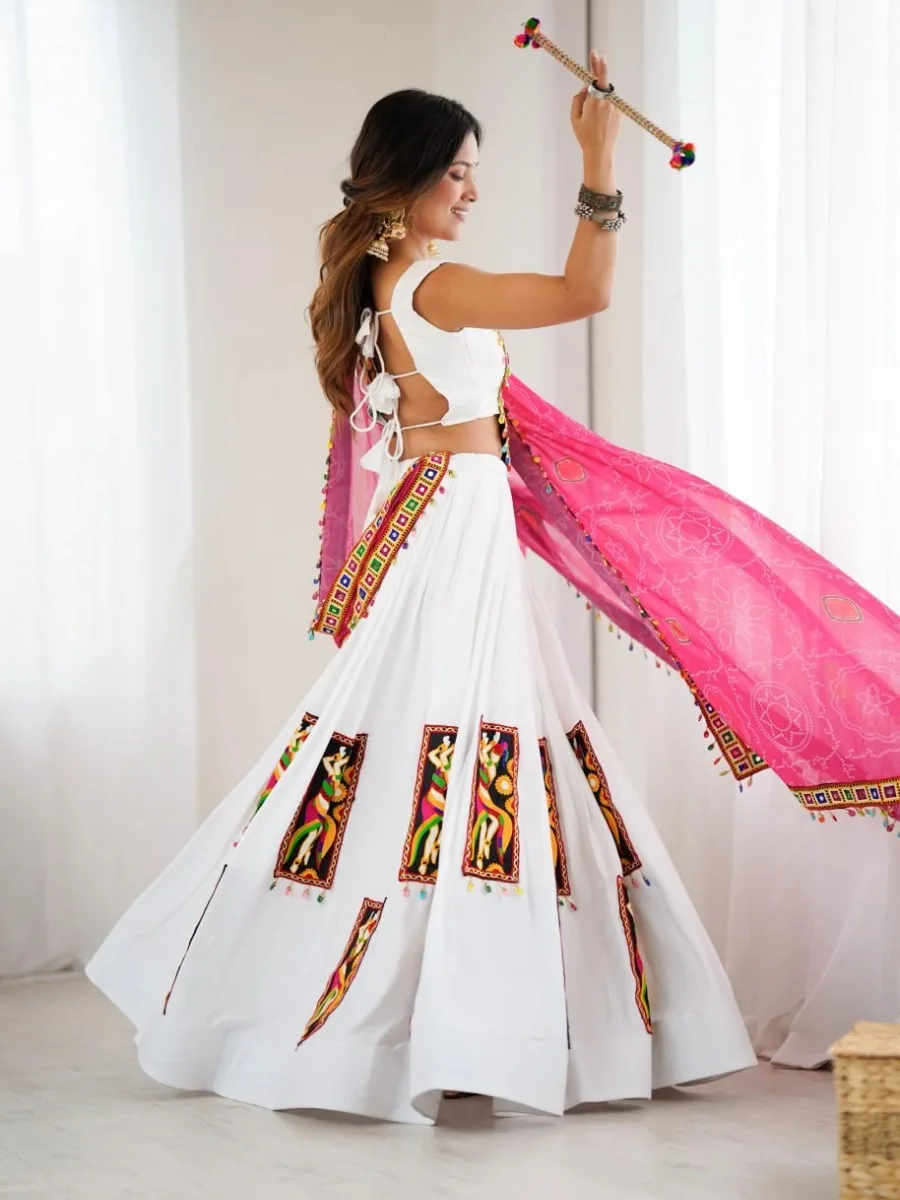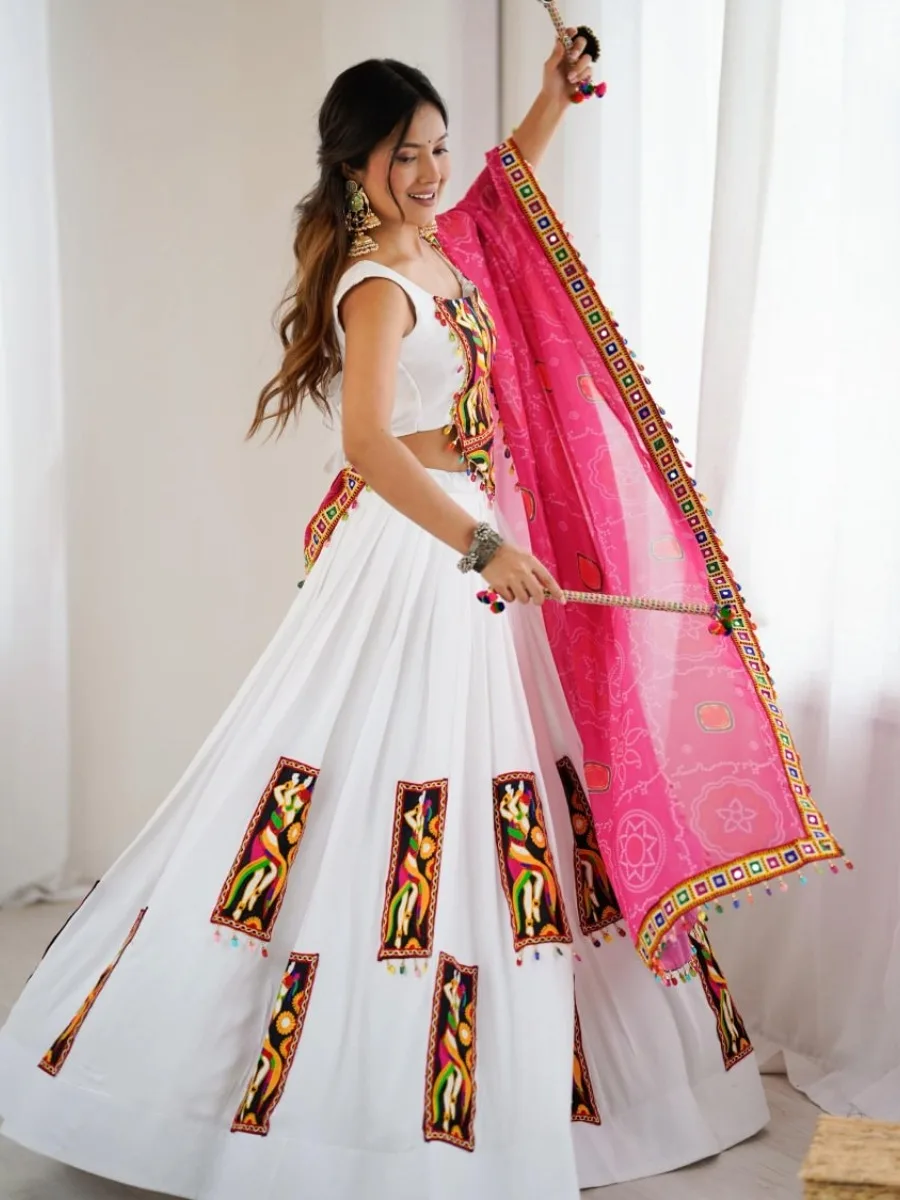 Paired with a faux georgette dupatta, digitally printed and bordered with Gamthi lace work, this ensemble exudes a perfect blend of tradition and modern vibrancy. Ideal for weddings, festive nights, and Navratri garba celebrations.