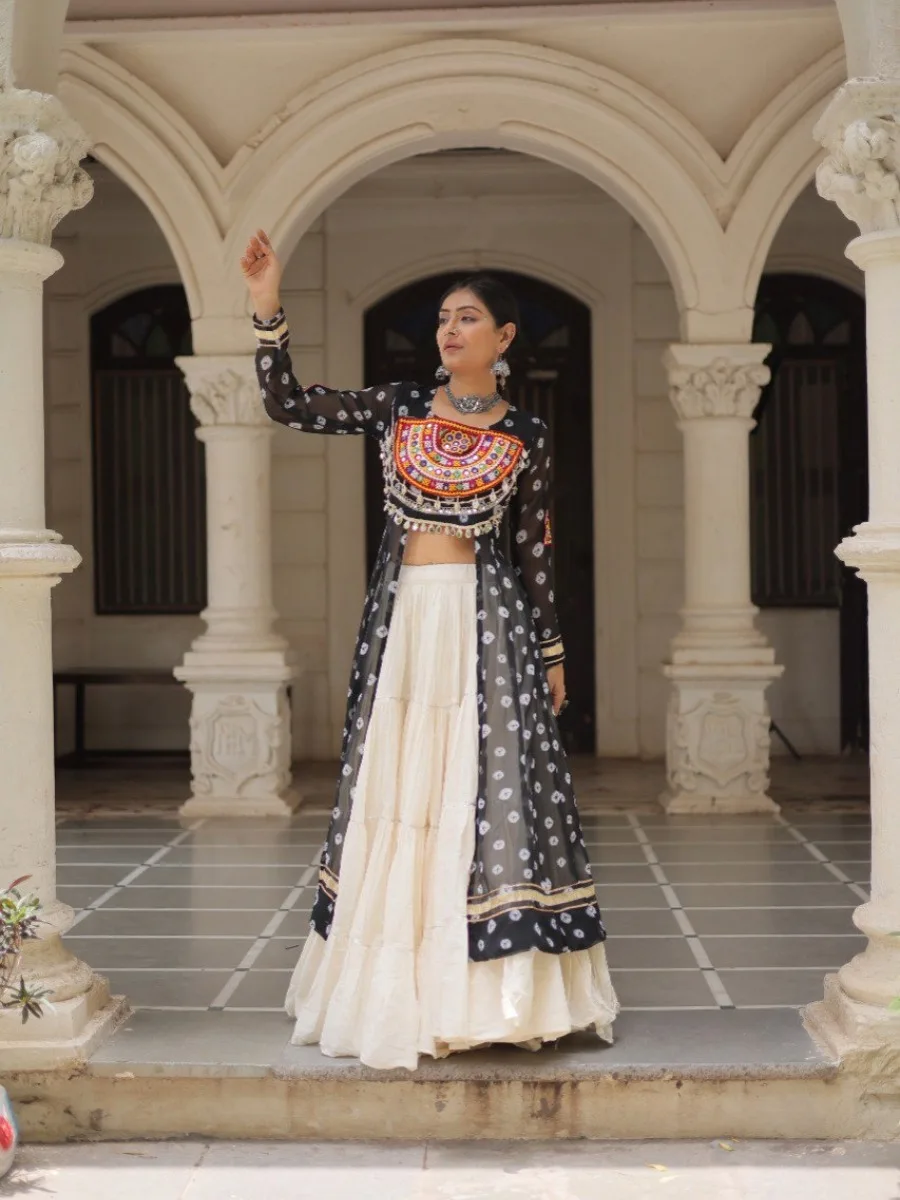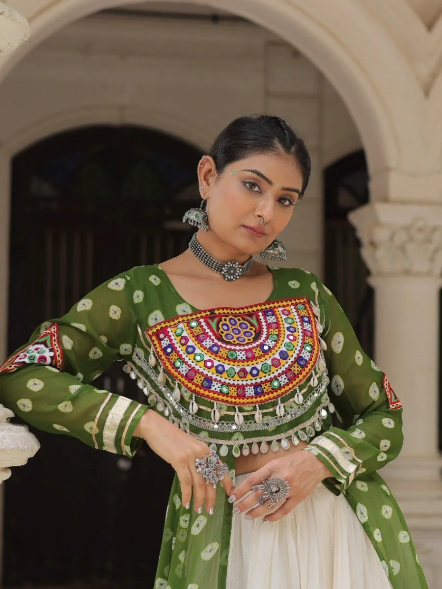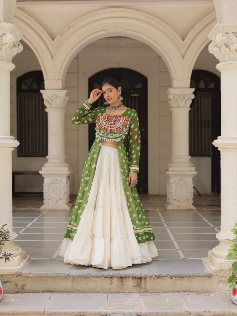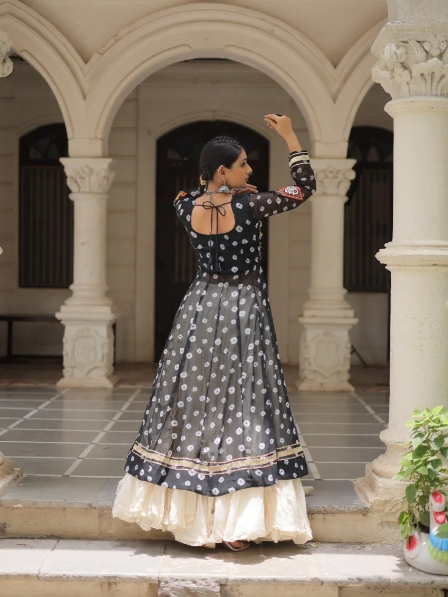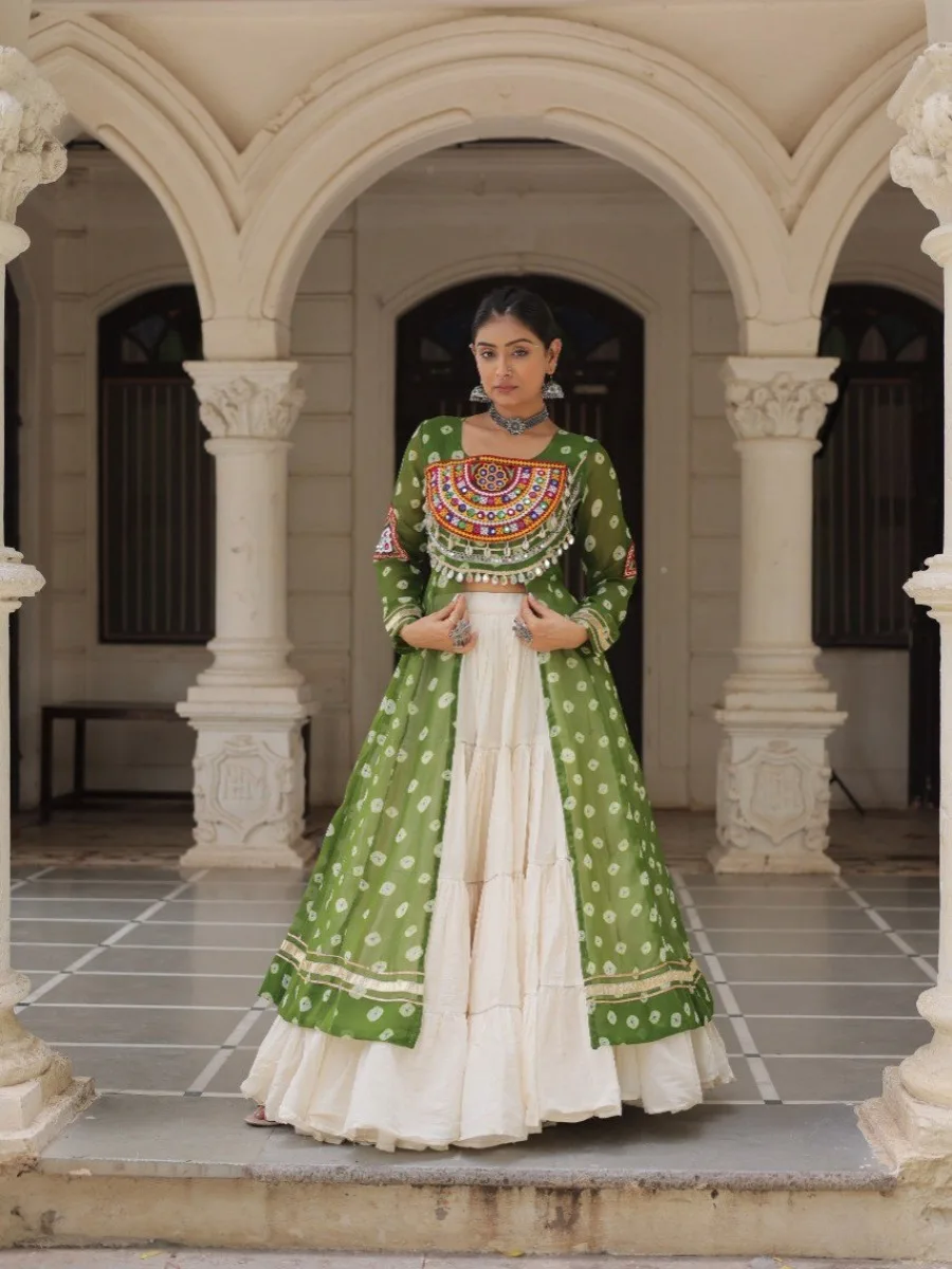 Elevate your ethnic wardrobe with this stunning Bandhani Print Kurti paired with a Frilled Kora Cotton Lehenga. The kurti features intricate Kutchi patchwork on premium faux georgette with full sleeves for a regal look. The lehenga comes in full-stitched style with 12-meter flare, chain closure & elegant dori latkan, ensuring both comfort and style. Perfect for weddings, festive occasions, or cultural celebrations.