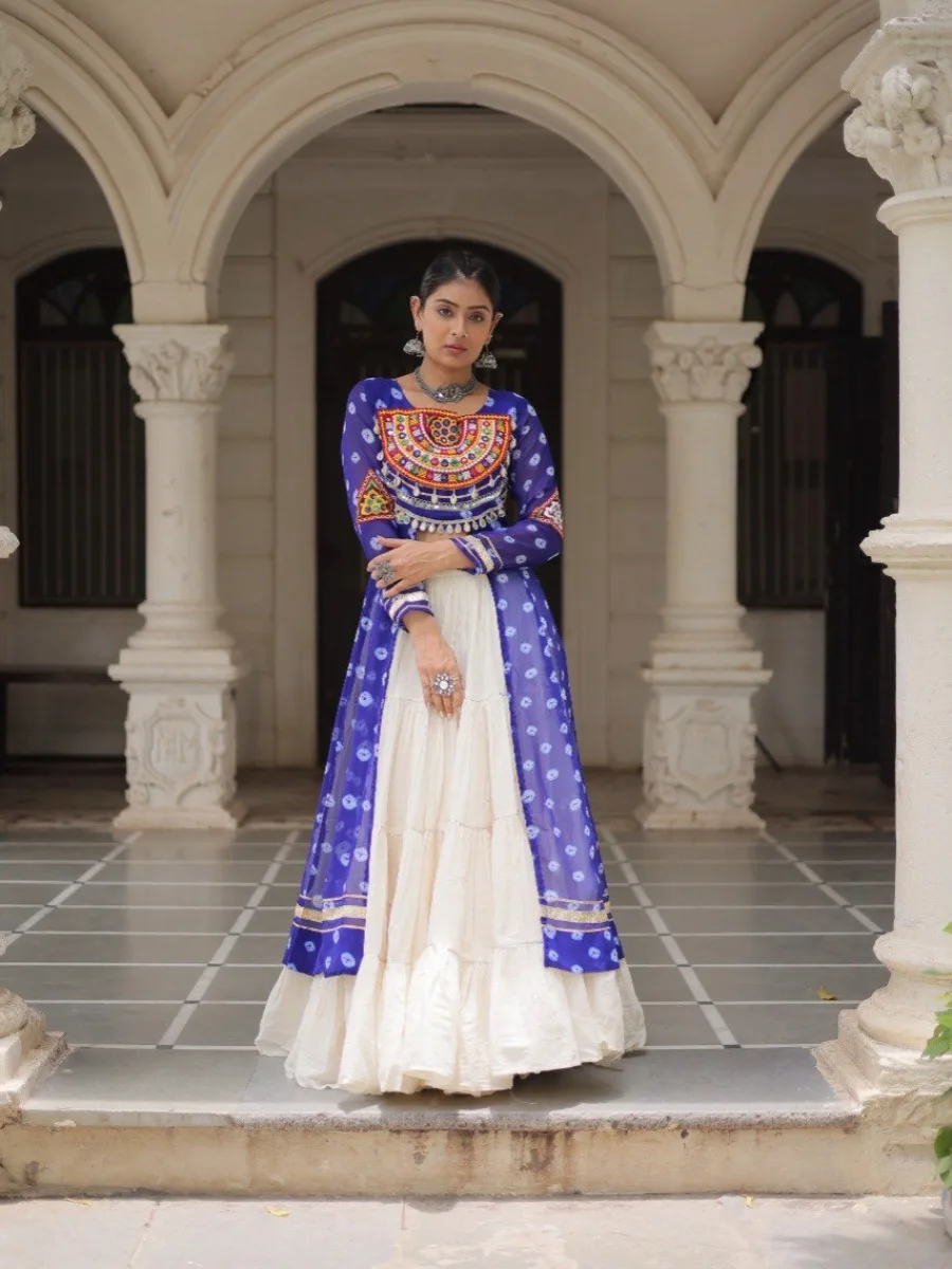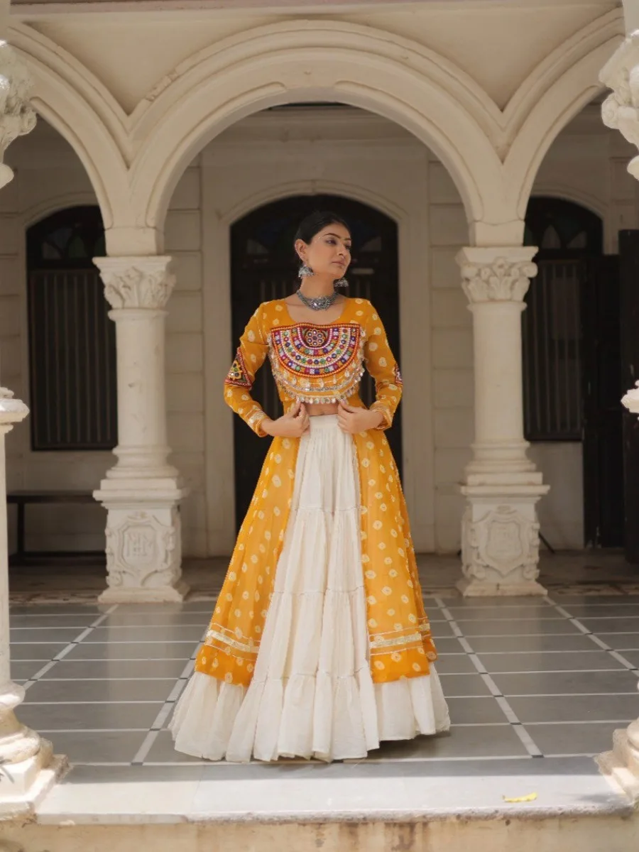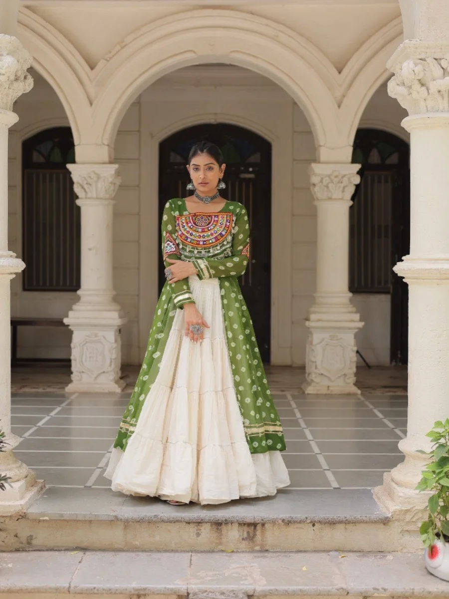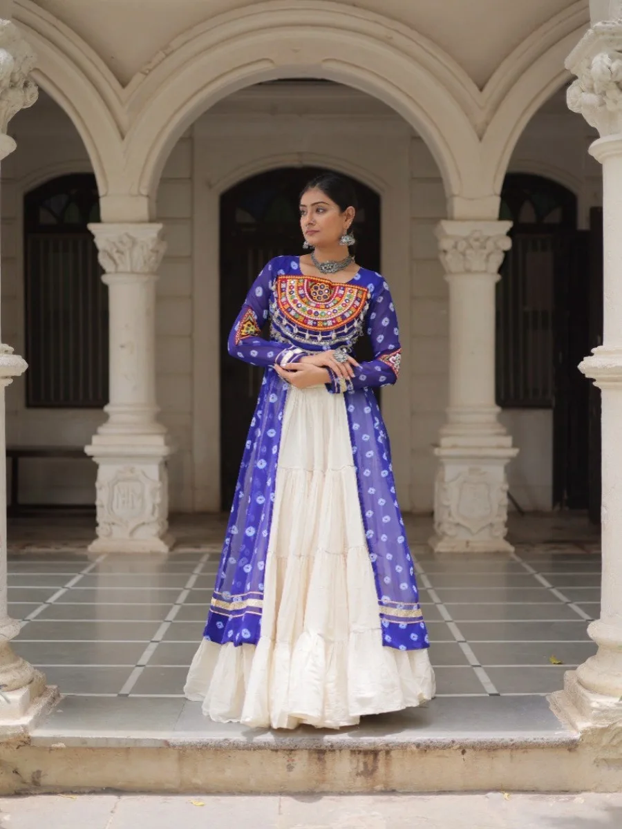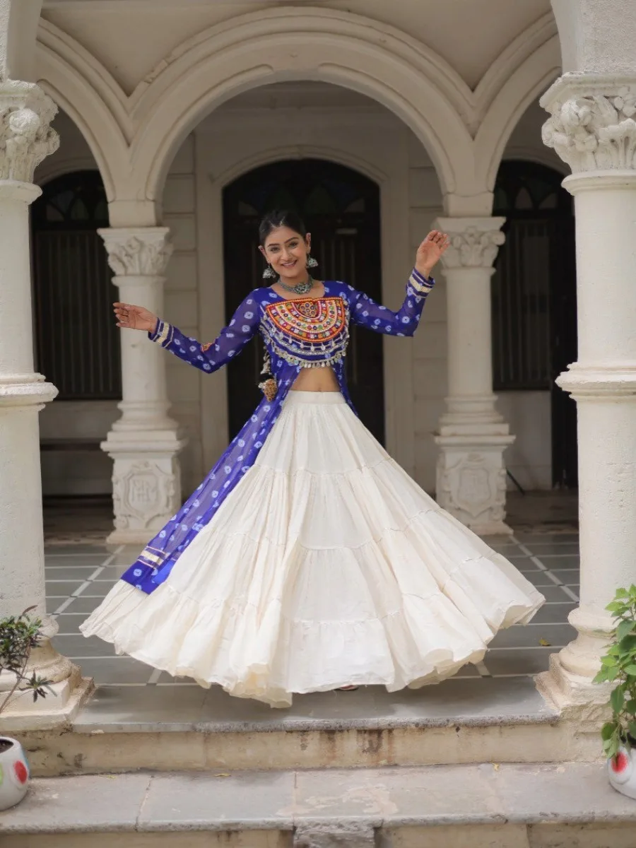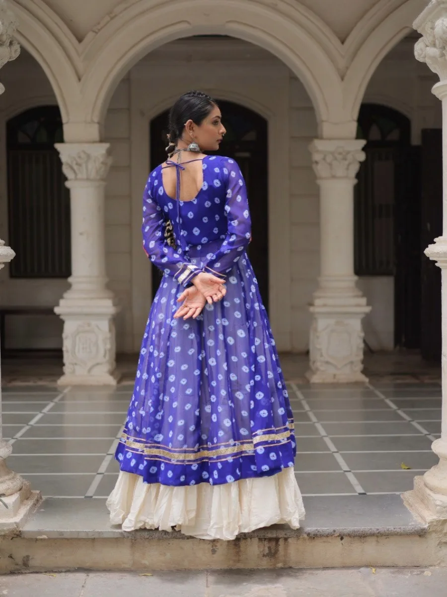 Elevate your ethnic wardrobe with this stunning Bandhani Print Kurti paired with a Frilled Kora Cotton Lehenga. The kurti features intricate Kutchi patchwork on premium faux georgette with full sleeves for a regal look. The lehenga comes in full-stitched style with 12-meter flare, chain closure & elegant dori latkan, ensuring both comfort and style. Perfect for weddings, festive occasions, or cultural celebrations.
