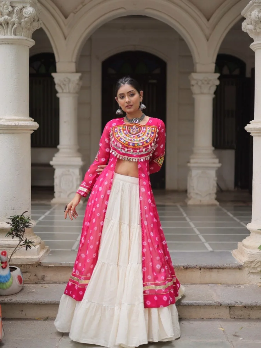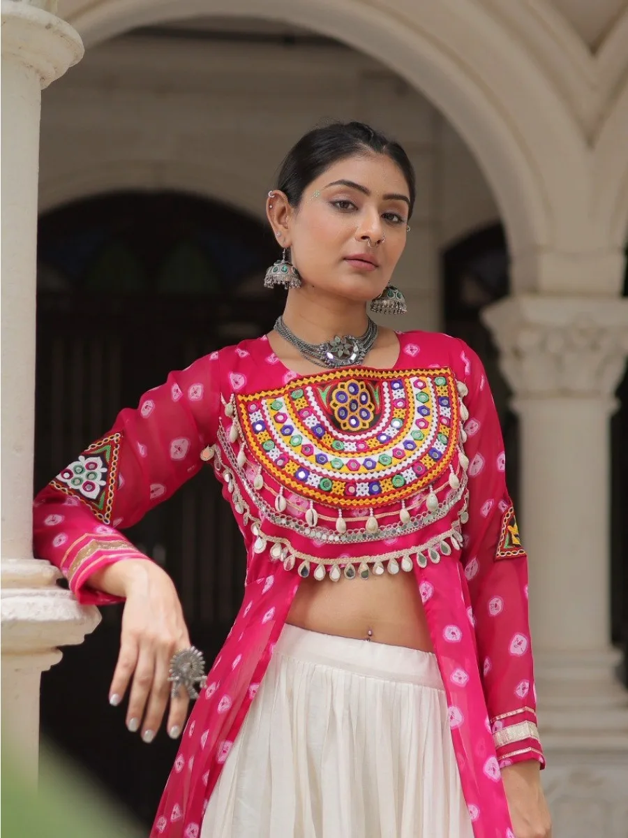 I absolutely loved this outfit! The pink jacket with Gamthi and mirror work is so vibrant and festive, while the off-white lehenga is super elegant and comfortable to wear. The embroidery detailing is even more beautiful in real life. I got so many compliments when I wore it for Navratri – it’s the perfect mix of tradition and style. Definitely worth it!”