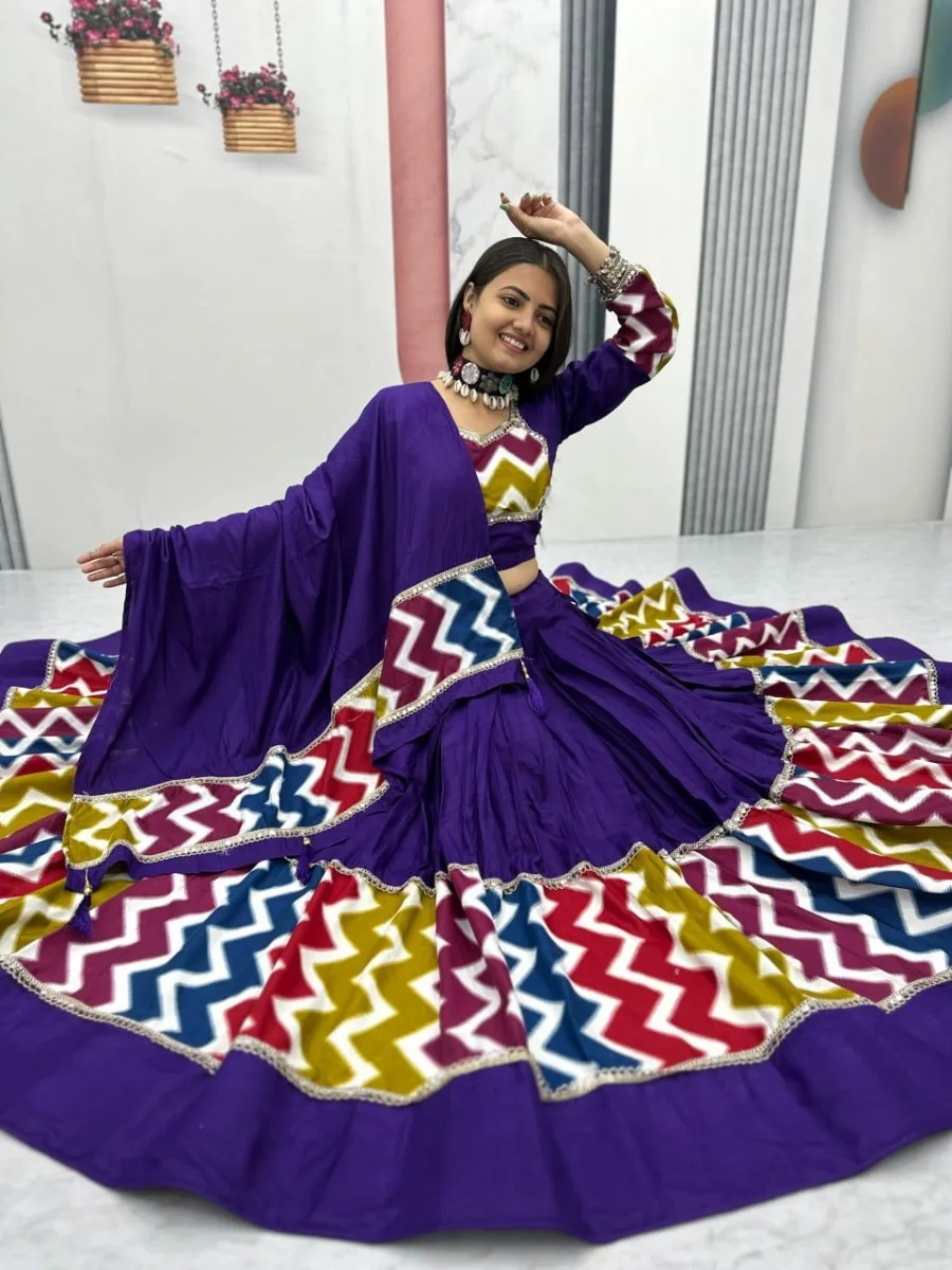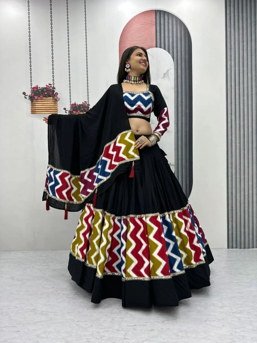 Navratri Special Pure Cotton Lehenga Choli with 6-meter big flair, vibrant multicolor zig-zag pattern, fully stitched blouse (M–L / XL–2XL margin) and matching 2.30m dupatta. Stylish, comfortable & festive-perfect!