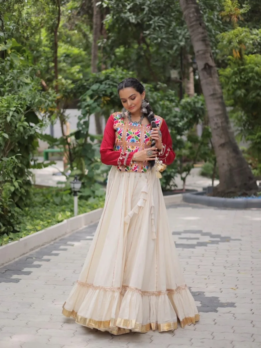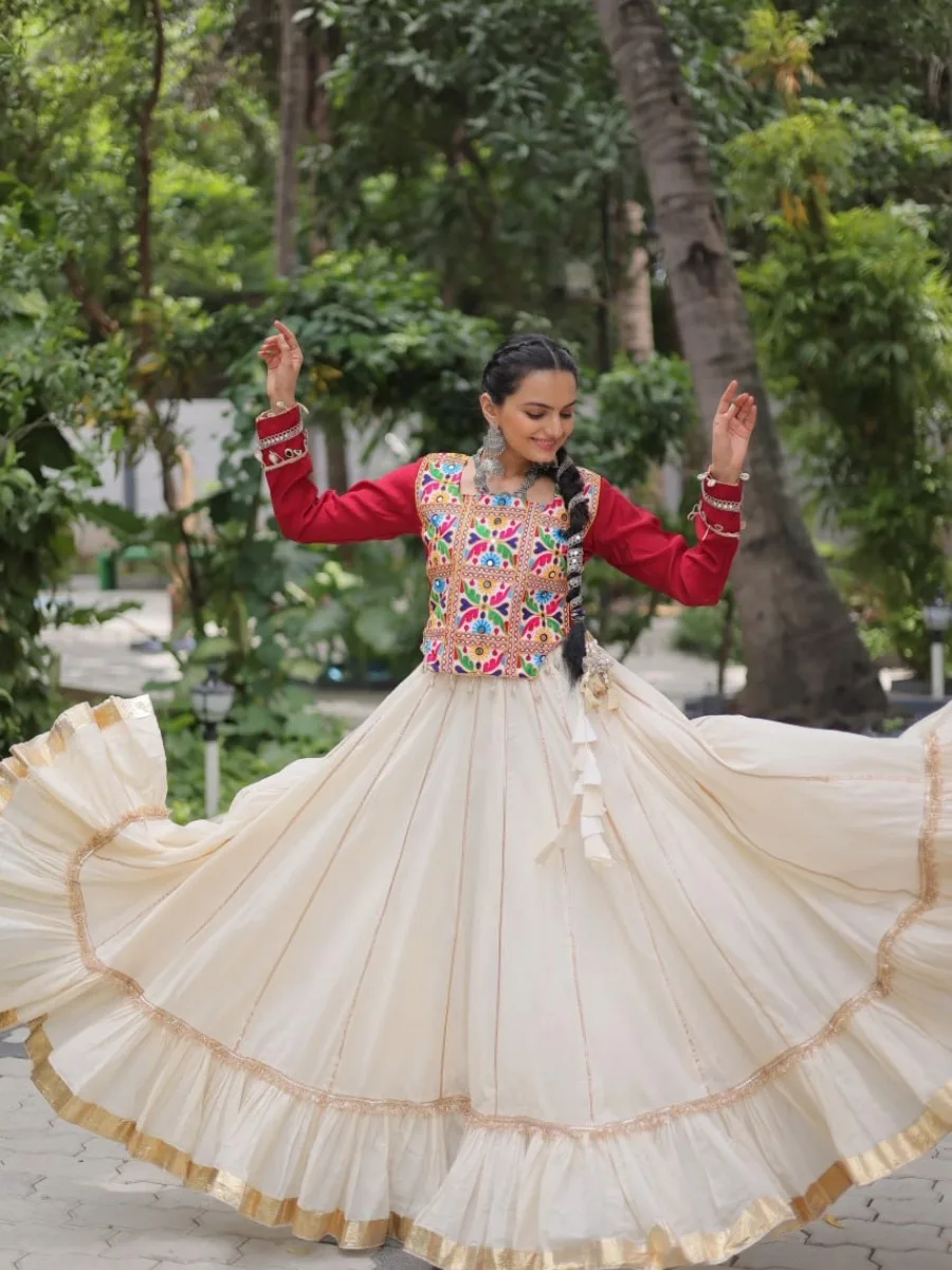 Elegant Navratri chaniya choli featuring a pure Kora Cotton ivory lehenga with golden gota-patti lace, styled in a grand 8-meter flair (16 kali stitching). Paired with a Roman silk red blouse adorned with authentic Kutchi Gamthi embroidery and mirror lace work. Perfect festive attire for Garba, Dandiya & cultural celebrations.