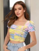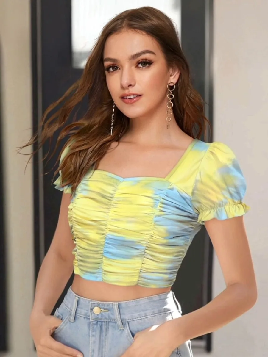 Vibrant charm with the Super Softy Ruched Tie-Dye Crop Top, designed for comfort and confidence. Featuring puff sleeves, a square neckline, and ruched detailing for a flattering fit, this top blends playful colors with a body-hugging silhouette.