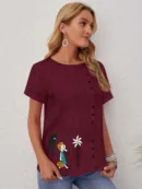 Bring charm and comfort together with this adorable women’s short-sleeve T-shirt, designed for those who love a touch of fun in their wardrobe. Made from soft, breathable fabric, it features a round neckline, stylish front buttons, and a whimsical embroidered scene — a cute girl walking beside a playful shadow and a palm tree. The asymmetrical button placement adds a modern twist, while the relaxed fit ensures easy movement. Perfect for casual days, coffee dates, shopping trips, or vacations, this T-shirt is sure to turn heads while keeping you comfortable all day.